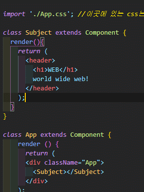 아래에 App 클래스에 div박스 안으로 Subject 태그를 넣어주면 끝