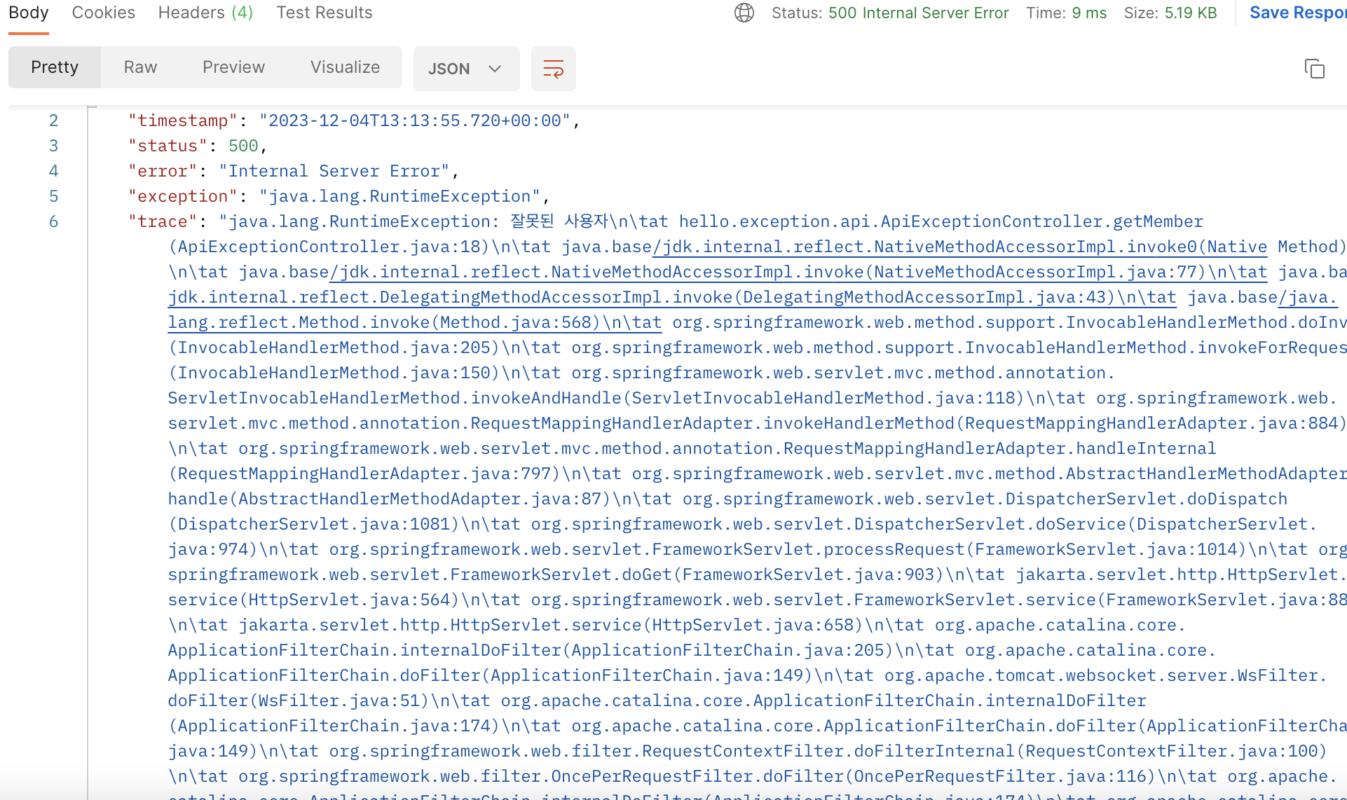 api 요청이 실패할 경우에는 html 으로 실패값이 와서는 안된다. 일반 예외와 같이 boot는 BasicError 컨트롤러를 이용해서 api 실패 예외처리도 해준다.
