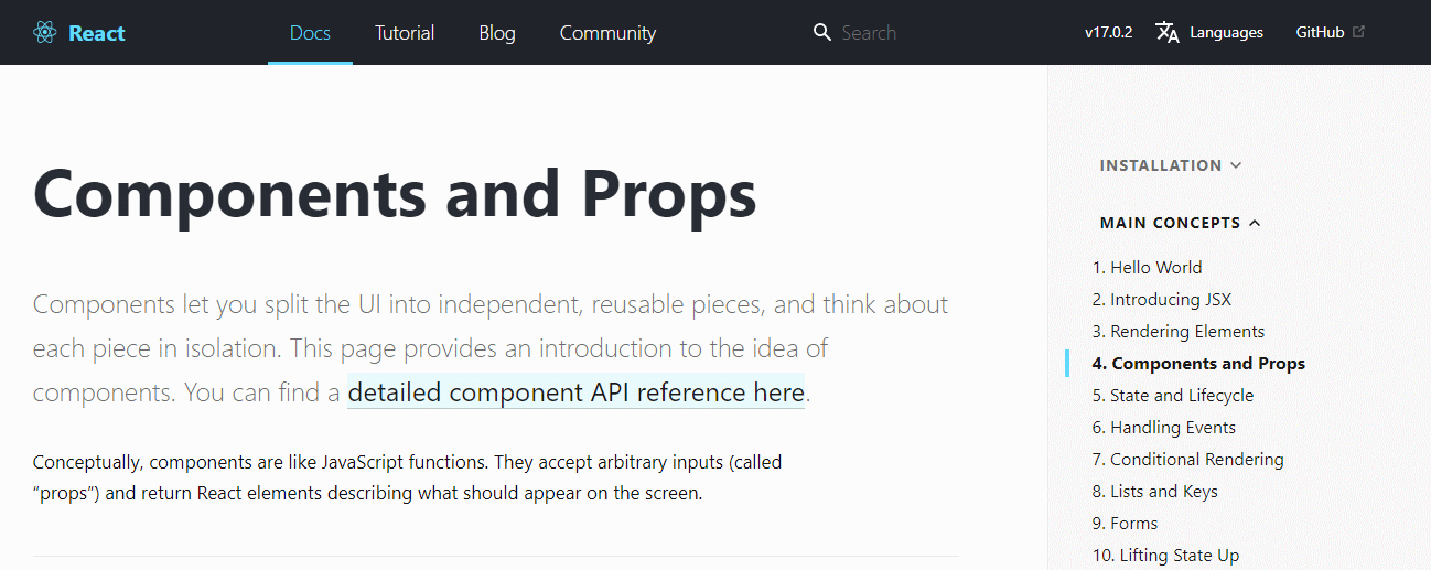 홈페이지에 가보면 개발문서에 컴포넌트와 프롭스에 대해 사용 할 수 있도록 정리 되어있다.