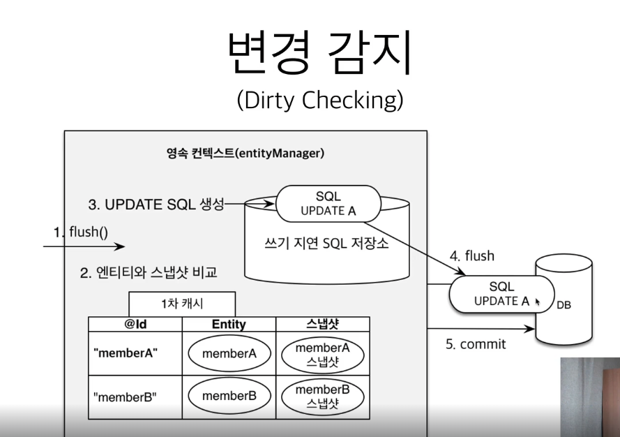 - 트랜잭션이라는 작업 단위가 중요 -> 커밋 직전에만 동기화함녀 됨
