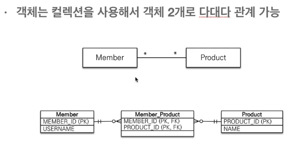 - 객체는 컬렉션을 사용해서 객체 2개로 다대다 관계 가능