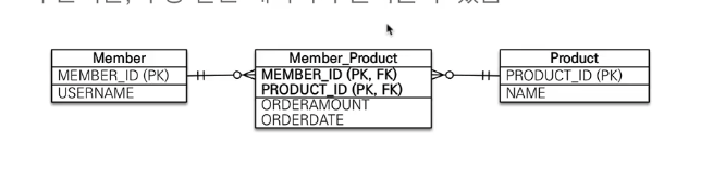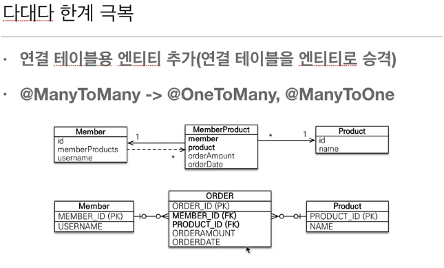 - 관계형 데이터 베이스는 정규화된 테이블 2개로 다대다 관계를 표현할 수 없음