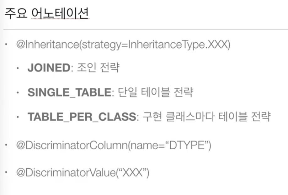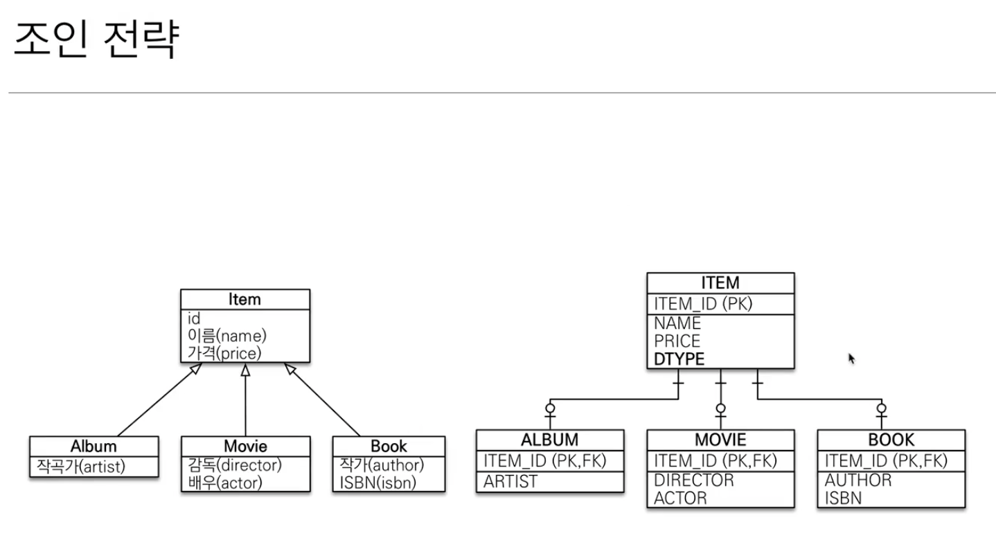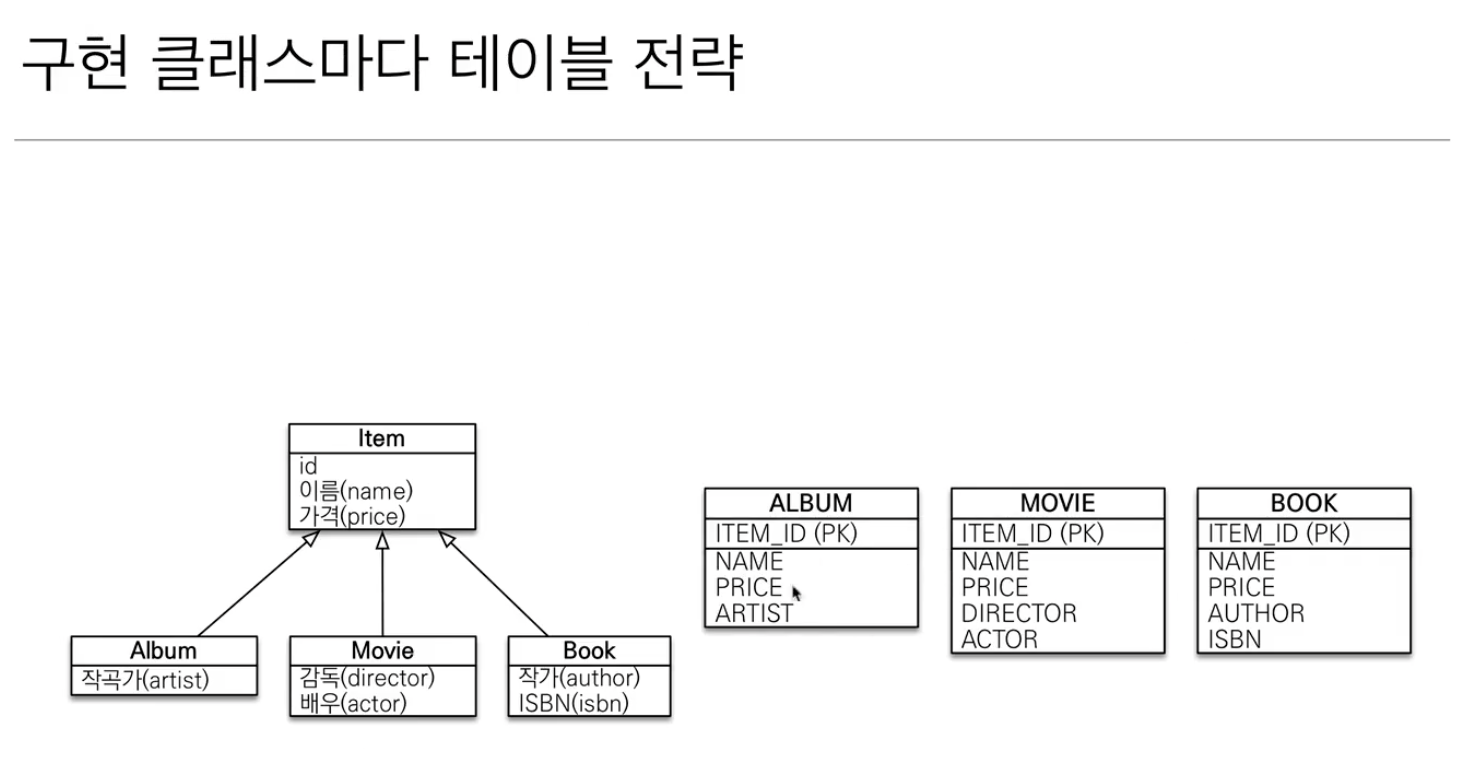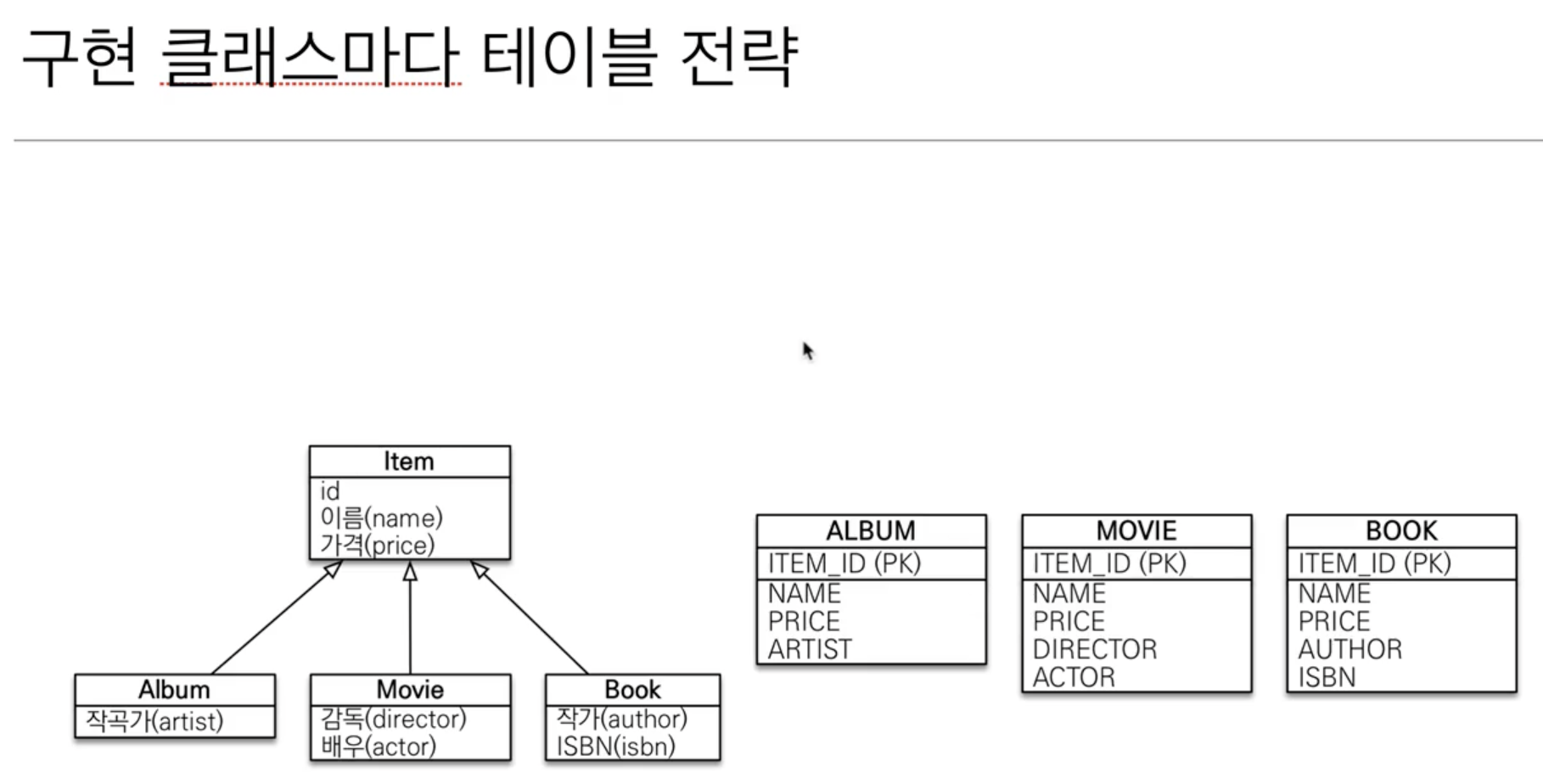 ㄴ 서브타입 테이블로 변환 -> 구현 클래스마다 테이블 전략