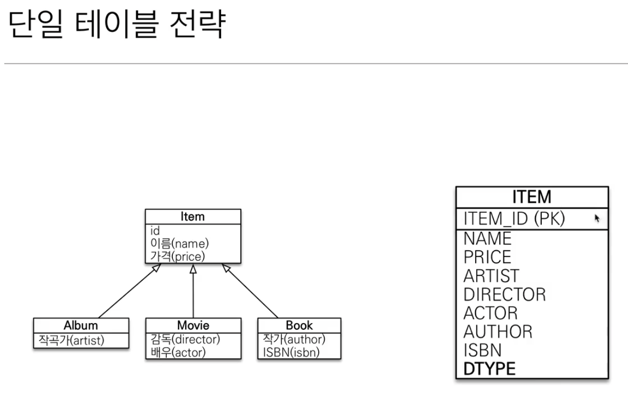 이 상황에서 만약 단일 테이블 전략을 사용한다면