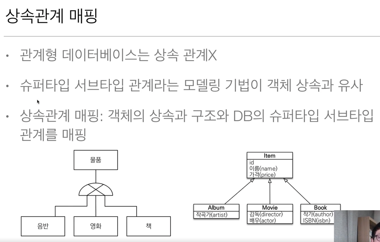 - 슈퍼타입 서브타입 관계라는 모델링 기법이 상속과 유사