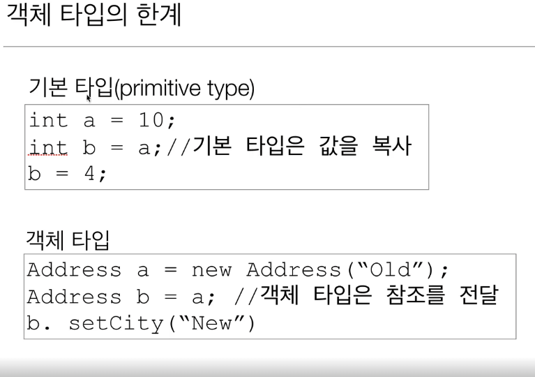 - 객체 타입은 참조 값을 직접 대입하는 것을 막을 방법이 없다.