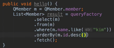 List<Member> resultList = em.createQuery("select m from Member m where m.username like '%kim%'", Member.class).getResultList();