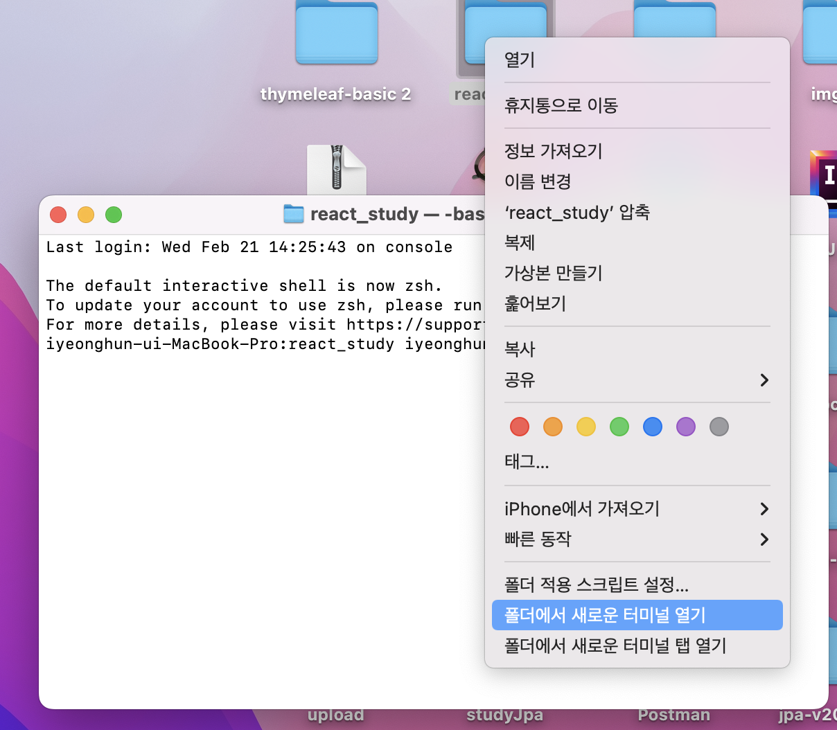 그 뒤에 바탕화면에 폴더를 만들고 폴더 우클릭 -> 터미널 열기를 클릭한다
