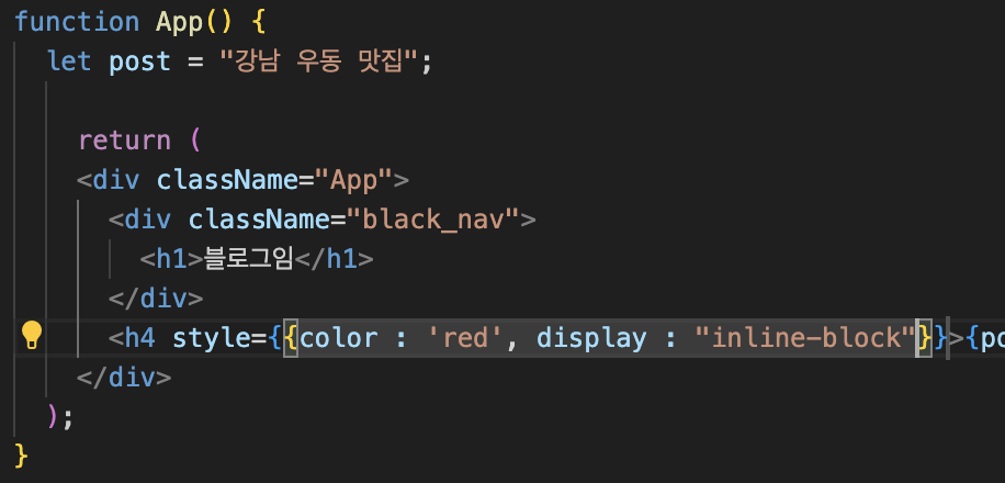 3. 만약 스타일을 넣으려면 이렇게 오브젝트 문법으로 넣어줘야 한다.(만약 font-size를 사용한다면 fontSize로 해야한다. 여기는 js이다 카멜케이스로 써줘야한다)