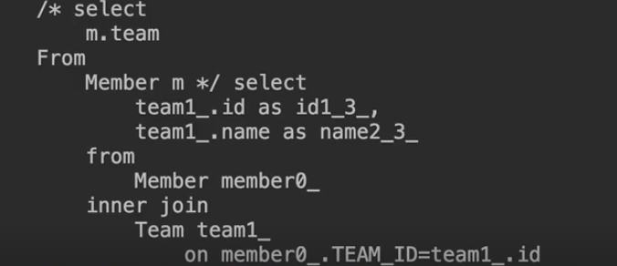이렇게 Member 엔티티 안에 team을 가져오면 쿼리는 어떻게 나갈까?