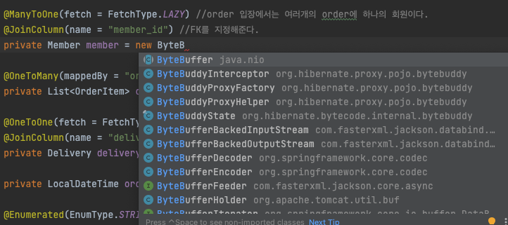 - member에는 지연로딩이 걸려있다(FetchType.LAZY). 지연로딩의 경우 프록시 객체를 가짜로 넣어놓고 나중에 조회할 때에 진짜 객체로 갈아치우는 방식으로 진행된다. 그 가짜객체가 bytebuddy이므로 조회하지 않았다면 json으로 만들 때에 저 객체를 어떻게 할줄 몰라 발생하는 오류이다.