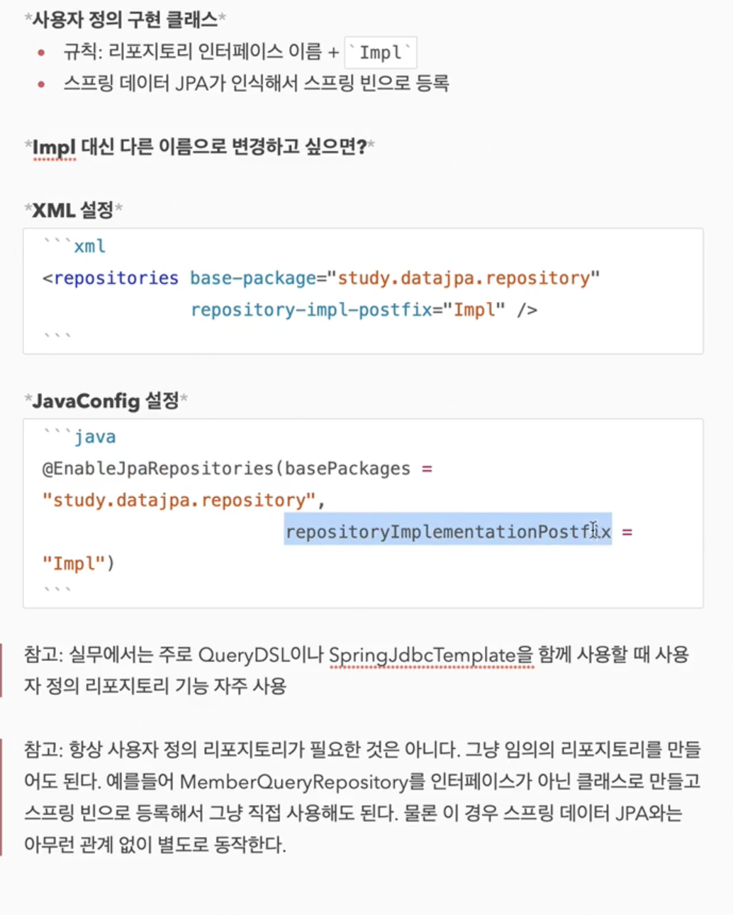 (예: MemberRepository가 JPARepository를 상속받았다면, 꼭 custom 인터페이스의 구현체는 MemberRepositoryImpl이 되어야한다.)