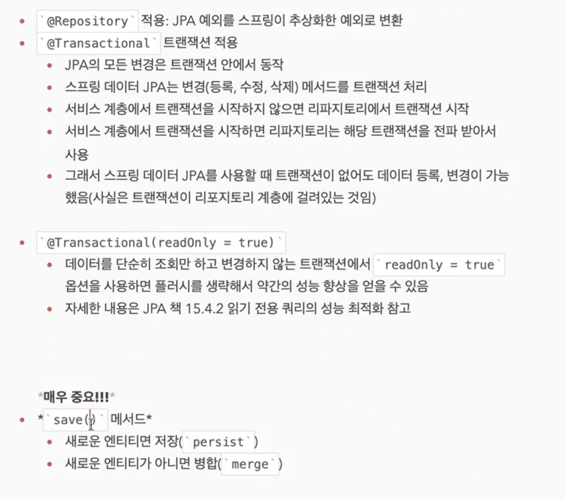 - 메소드를 확인하면 알겠지만, Tranjection이 걸려 있어서, 만약 트렌젝션을 서비스에서 걸지 않더라도 알아서 진행한다. (하지만 영속성턴텍스트를 이용해야하기 때문에 서비스에 걸어주는게 맞다)