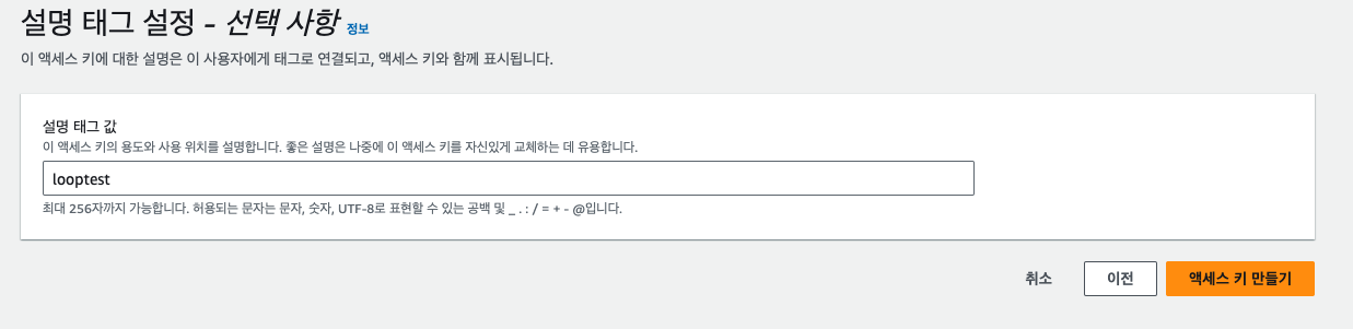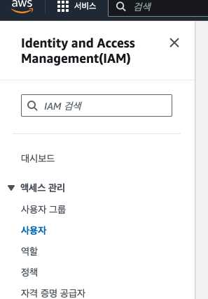 AWS Console > IAM > 엑세스 관리자 > 사용자 > 생성한 사용자 이름 클릭 > 보안 자격 증명 > 엑세스 키 만들기 클릭