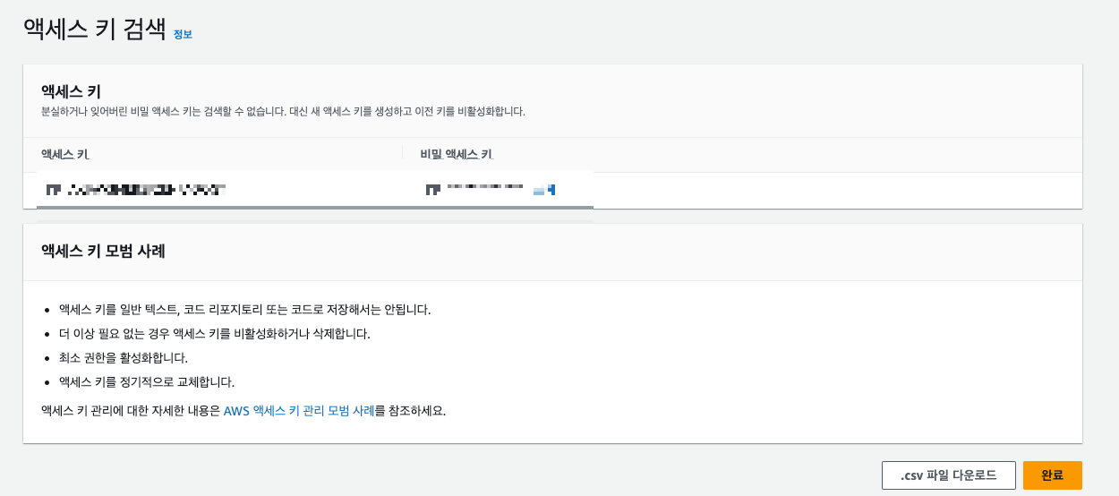 액세스 키와 비밀 액세스키는 csv파일로 저장해 두거나, 어디에 적어놓아야 한다.