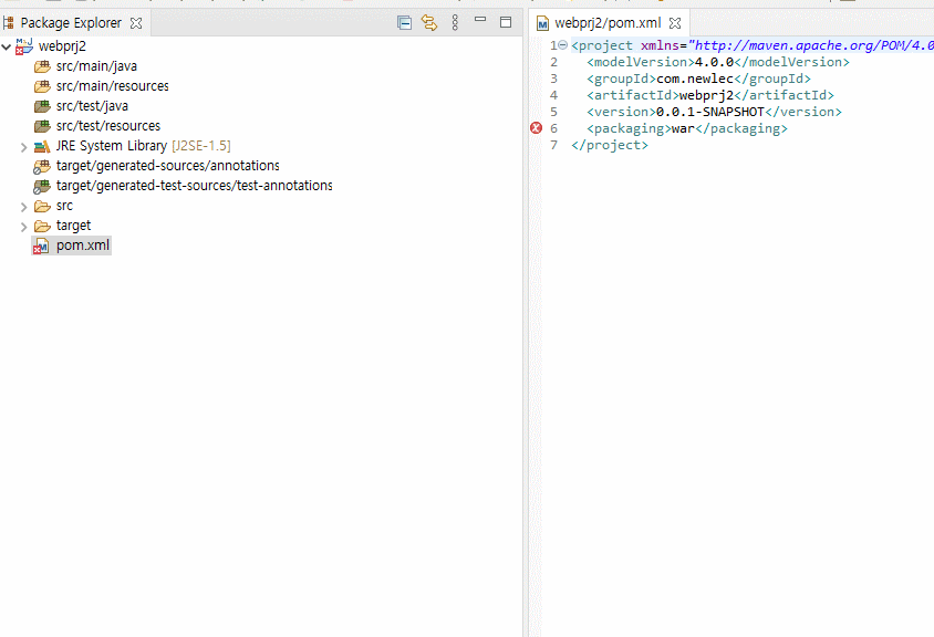 이렇게 프로젝트를 만들고 나면 pom.xml에서 web.xml이 없다는 에러가 뜨게된다