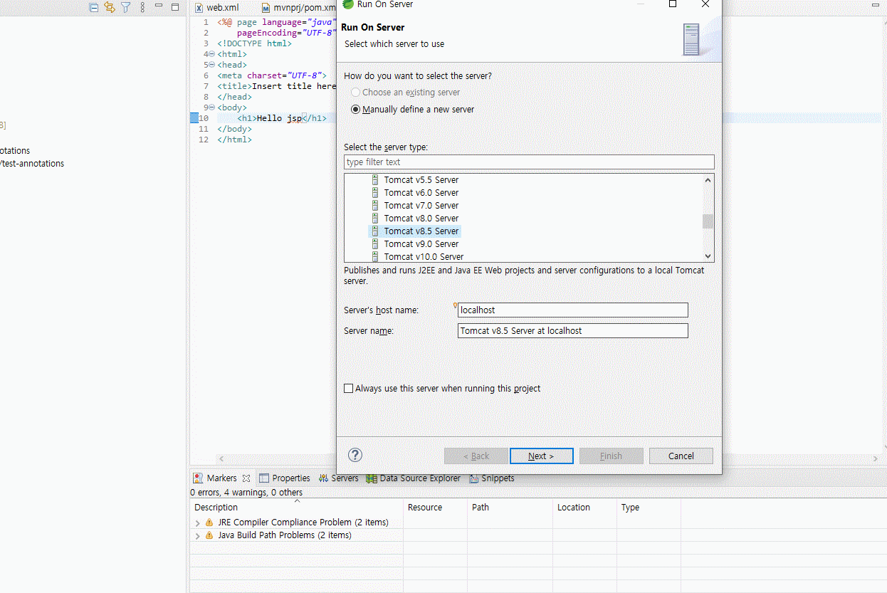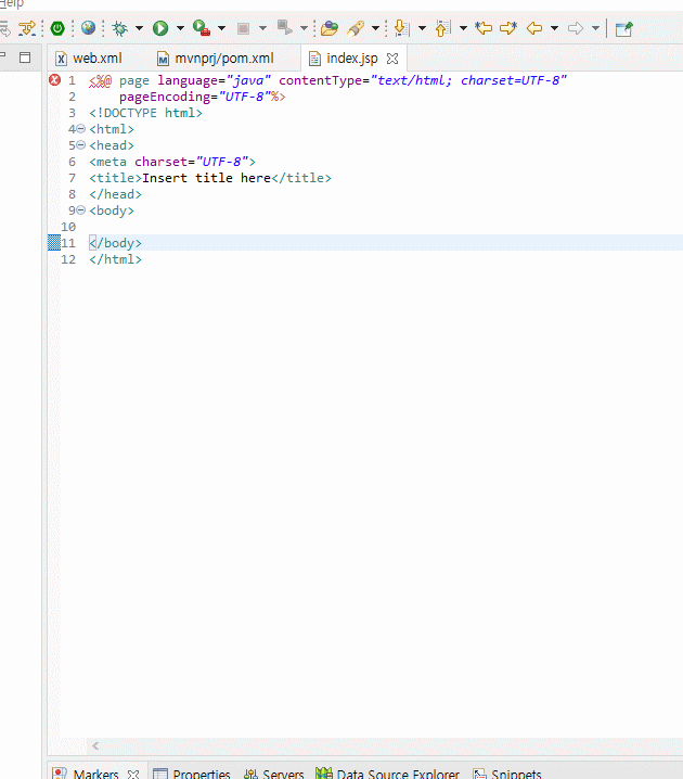 빨간줄이 그어져 있는 부분은 jsp관련 라이브러리가 없어서이니 추가해줘야한다