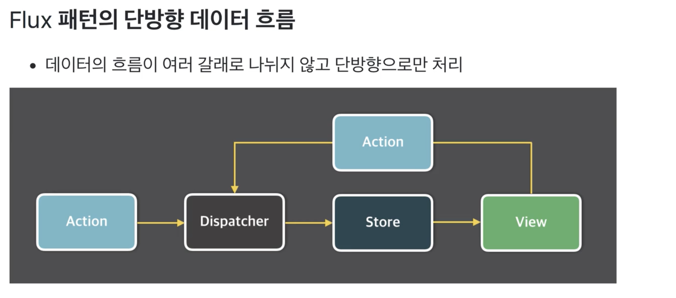 React에서 Flux라는 패턴으로 복잡한 애플리케이션의 문제점들을, 무수한 관리 문제점을 관리를 해결했다.