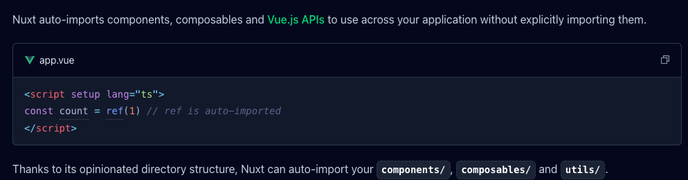 components/. composables/, utils/ 하위의 파일은 모두 자동으로 임폴트 된다.