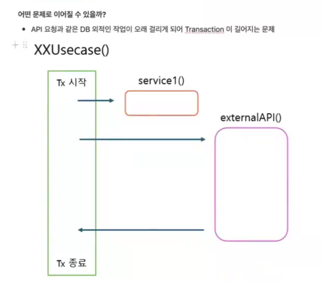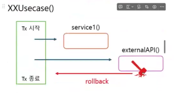 - DB 외적인 작업의 실패가 Transaction의 범위로 전파되어 전체 비즈니스 로직이 rollback되는 문제