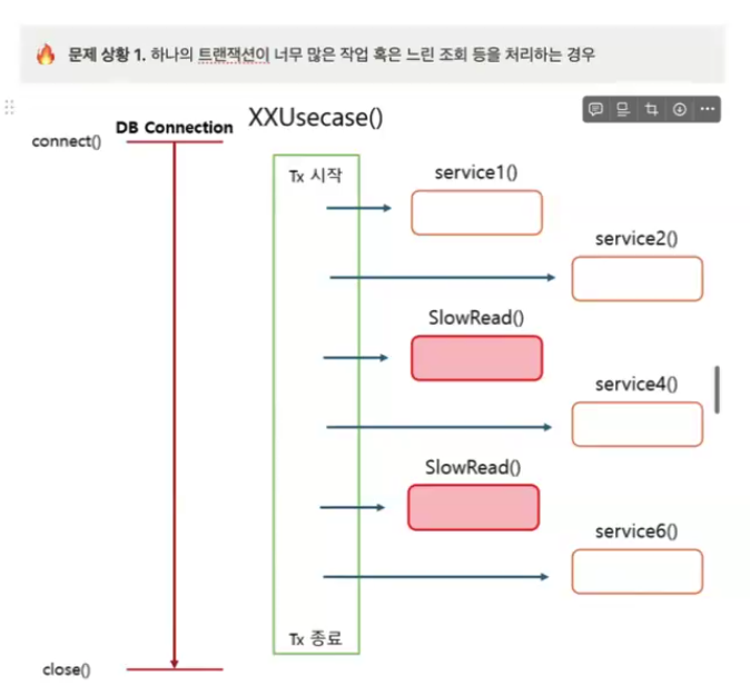 - 비대해진 트랜잭션 내의 각 작업을 작은 단위의 트랙잭션으로 분리할 수 있음