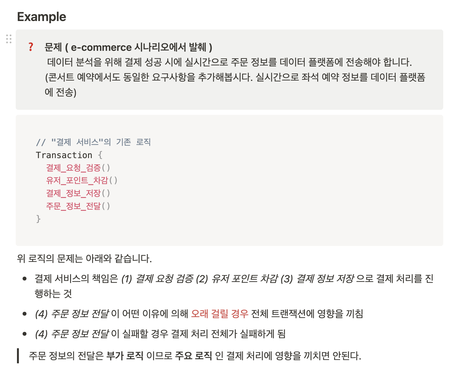 - 만약 이벤트에 의해 파생된 작업이 실패하였을 때, 원본 작업 또한 실패 처리를 해야한다면 이를 위한 처리가 필요함 (keyword : 보상 트랜잭션, SAGA 패턴)