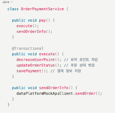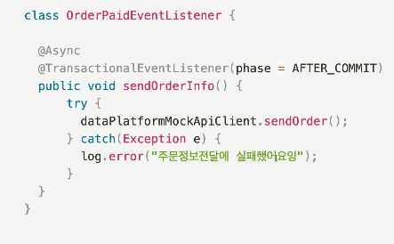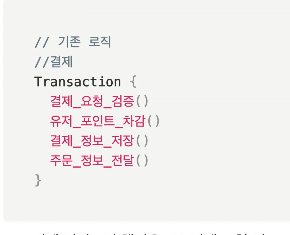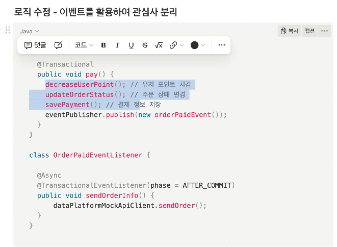 여기서 주문정보전달은 결제의 부가적인 로직이기 때문에 분리 되어야 한다.