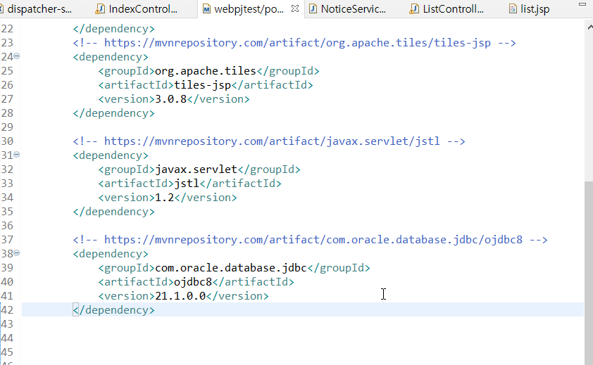 먼저 오라클 데이터베이스 연결을 위해서 JDBC를 POM에 옮겨 줘야한다.