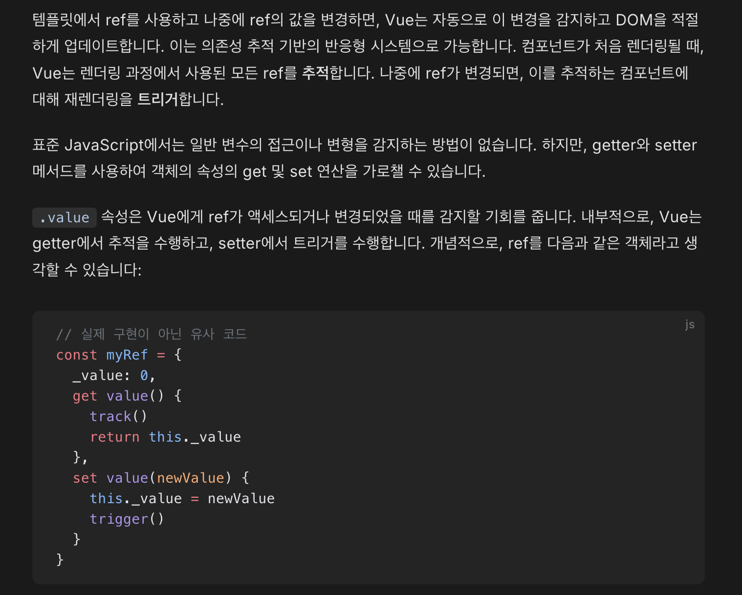애초에 vue를 사용할 때 자연스레 reactivity를 사용하고 있어서 못느끼겠지만 사실 내부에서는 값이 바뀔 때마다 set(), get()을 해준다고 봐야한다. 그걸 ref() 함수로 대체했다는 것이 이해하기 좋다.