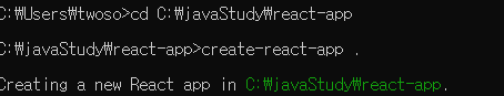 그런 뒤에 create-react-app . 을 입력한다 ( 한칸 띄우고 . 을 꼭 입력해야합니다)