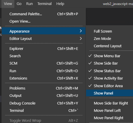 툴은 비쥬얼 스튜디오 코드를 사용한다. 상단 바에 view -> Appearance -> show Panel 을 누르면 하단에 패널이 표시 되는데