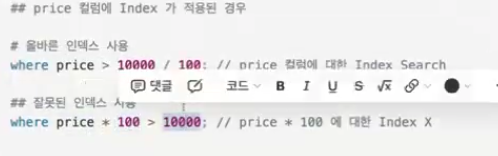 - 앞서 말했던 자주 삽입, 수정되는 데이터에 대해 Index를 적용할 경우 "배보다 배꼽이 커지는" 문제가 발생할 수 있음 (인덱스 또한 공간을 차지 하므로)