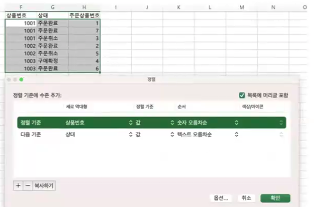 그림과 같이 정렬 기준을 보면 상품번호 - 숫자 오름차순, 상태 - 텍스트 오름차순 으로 만들어졌다.