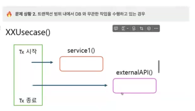 - DB 외적인 작업의 실패가 Transaction의 범위로 전파되어 전체 비즈니스 로직이 rollback되는 문제
